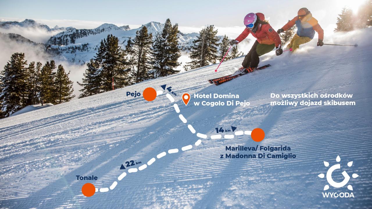 - możliwość samodzielnej jazdy na stokach Marilleva/ Folgarida/Tonale lub Pejo (konieczność wykupienia odpowiedniego karnetu). Sugerujemy karnet 3+3 (3x Pejo + 3x Superskirama) , możliwość zakupu na etapie rezerwacji lub maksymalnie na 7 dni przed wyjazdem. Transfer skibusem spod hotelu.